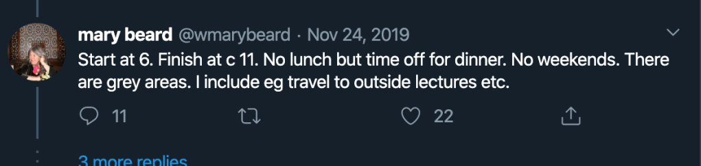 Dama angielska, Lady Marry Beard, zasłużona i bardzo utytułowana klasycystka z Uniwersytetu w Cambridge wywołała burzę medialną w listopadzie 2019, wyznając na Twitterze, że pracuje 100 h w tygodniu. Niby chciała innych zapytać, ale tak jakby trochę tym epatowała… A to przecież humanistka par excellance, klasycystka… Choć kropka niepotrzebna w jej ćwierku się wydarzyła…