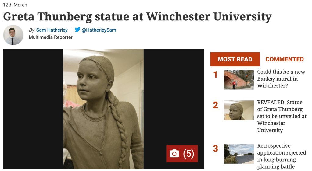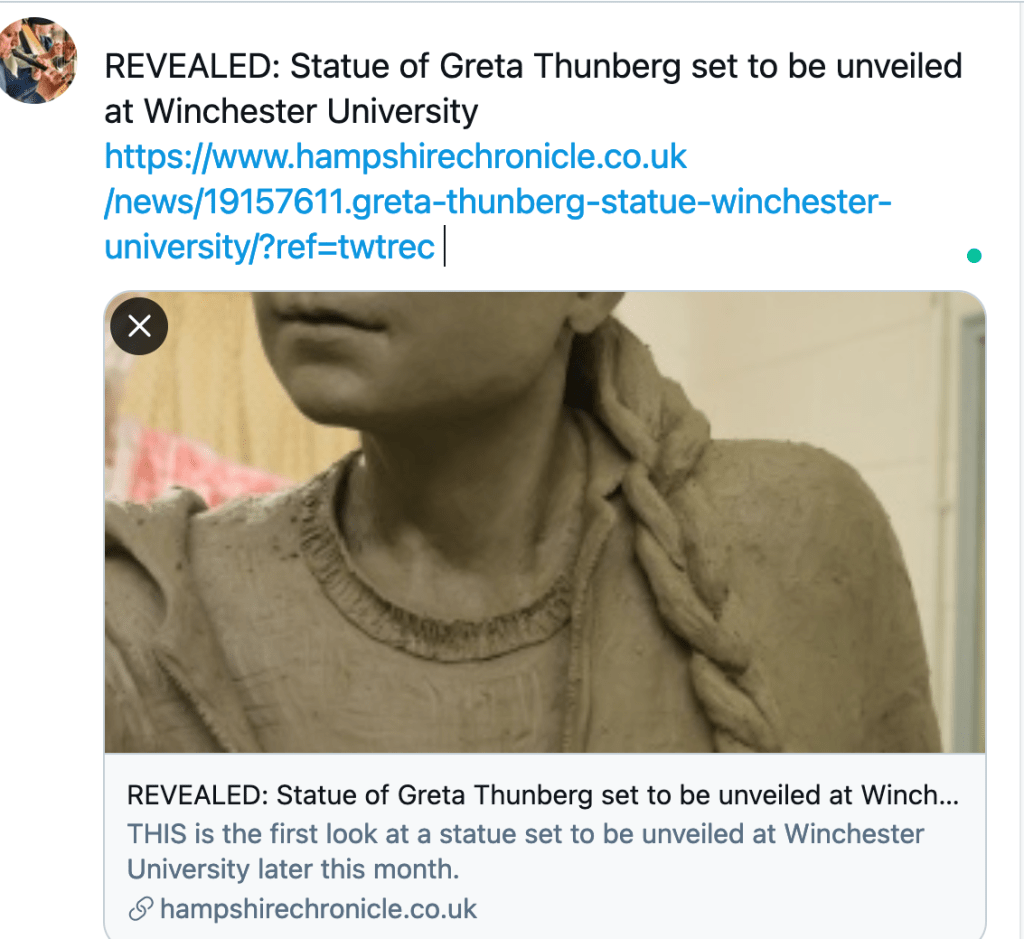 Greta Thunberg będzie miała swoją rzeźbę na kampusie Uniwersytetu Winchester w południowej Anglii, Hampshire, niedaleko Southampton. Jest to niewielka (niecałe 8 tyś. studentów) publiczna uczelnia, która powstała w 2005, mimo że jej początki oficjalnie sięgają do 1840 r. Posąg z brązu Grety Thunberg będzie odsłonięty tam 30 marca 2021 po roku pracy brytyjskiej rzeźbiarki Christine Charlesworth.