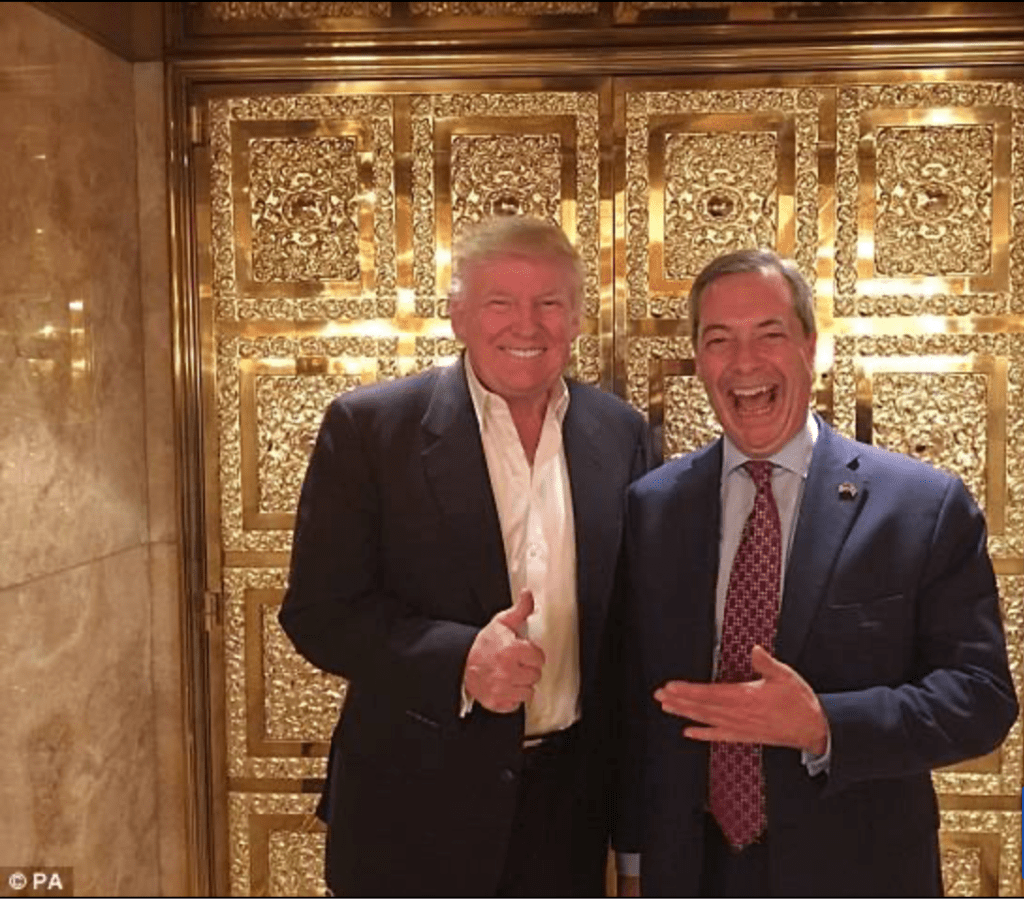 To jest neutralny, bezbarwny opis zdjęcia Donalda Trumpa ze spotkania z Nigelem Faragem z 2018 roku. Przypomnę, że Nigel Farage jest liderem Partii Brexit, którą wspomagała rosyjska propaganda na Wyspach Brytyjskich podczas referendum zakończonego wyjściem Wielkiej Brytanii z Unii Europejskiej.
