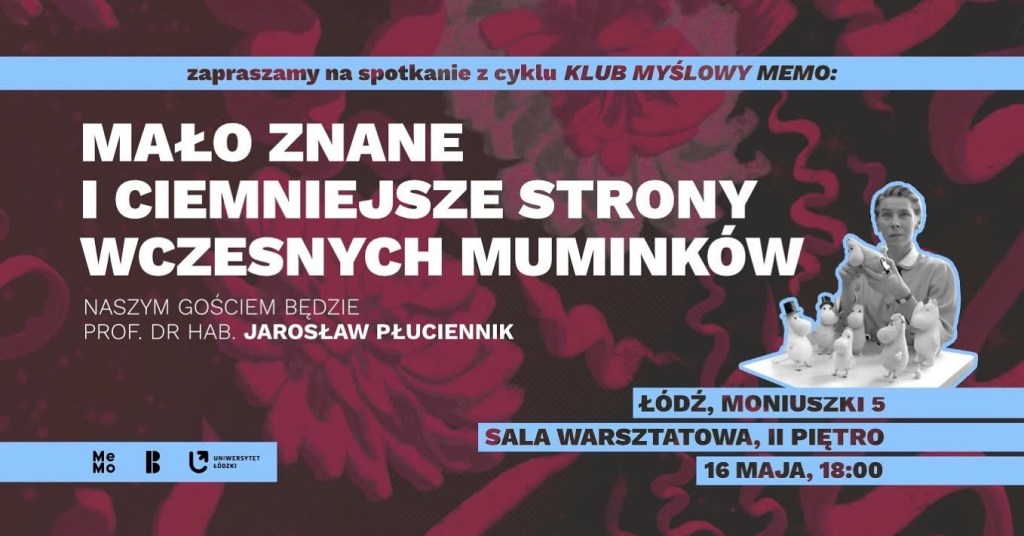 Wykład prof. Jarosława Płuciennika w Mediateka MeMo w Łodzi dnia 16 maja 2025 r., godz. 18:00. W ramach Klubu Myślowego MeMo Mediateka zaprasiła na spotkanie poświęcone „Mało znanym i ciemniejszym stronom Muminków.”
