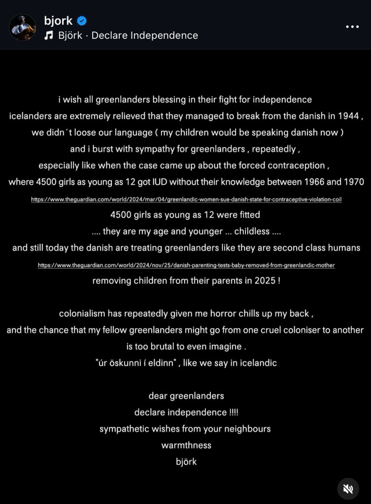 Opublikowany niedawno post Björk, zilustrowany mapą Grenlandii nałożoną na czerwono-białą flagę, jest jednym z najmocniejszych głosów artystycznych w nordyckiej sferze publicznej ostatnich miesięcy.