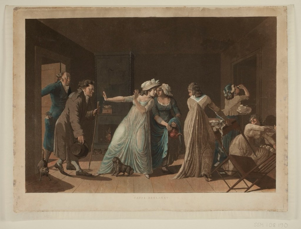 Jedyny obraz towarzyszący artykułowi pochodzi z 1799 roku i nosi tytuł Kaffebeslaget — Konfiskata kawy.